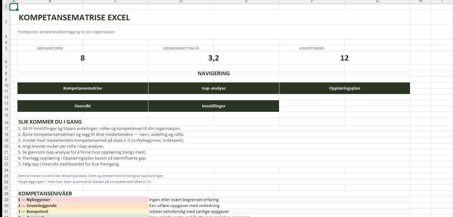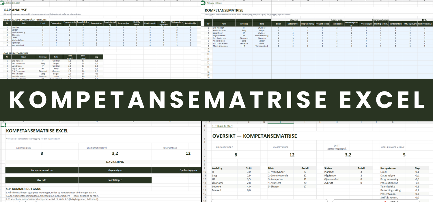 En profesjonell kompetansematrise i Excel med automatisk gap-analyse, heatmap-fargekoding og opplæringsplan. Identifiser kompetansegap og planlegg utviklingstiltak i tråd med Internkontrollforskriften – alt i én fil.