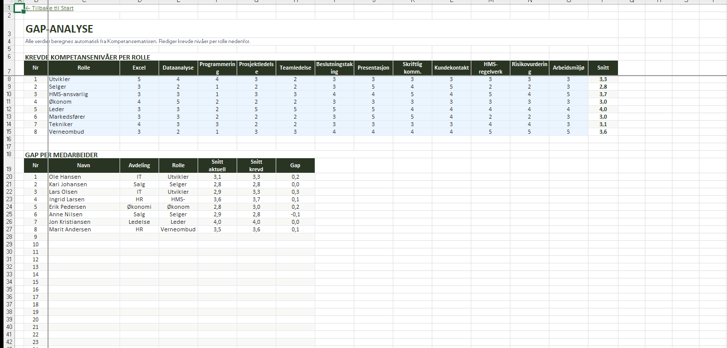 100% formeldrevet analyse i tre deler: krevde nivåer per rolle (redigerbart), gap per medarbeider (automatisk via INDEX/MATCH), og gap per kompetanseområde. Fargekoding viser hvor tiltak trengs.