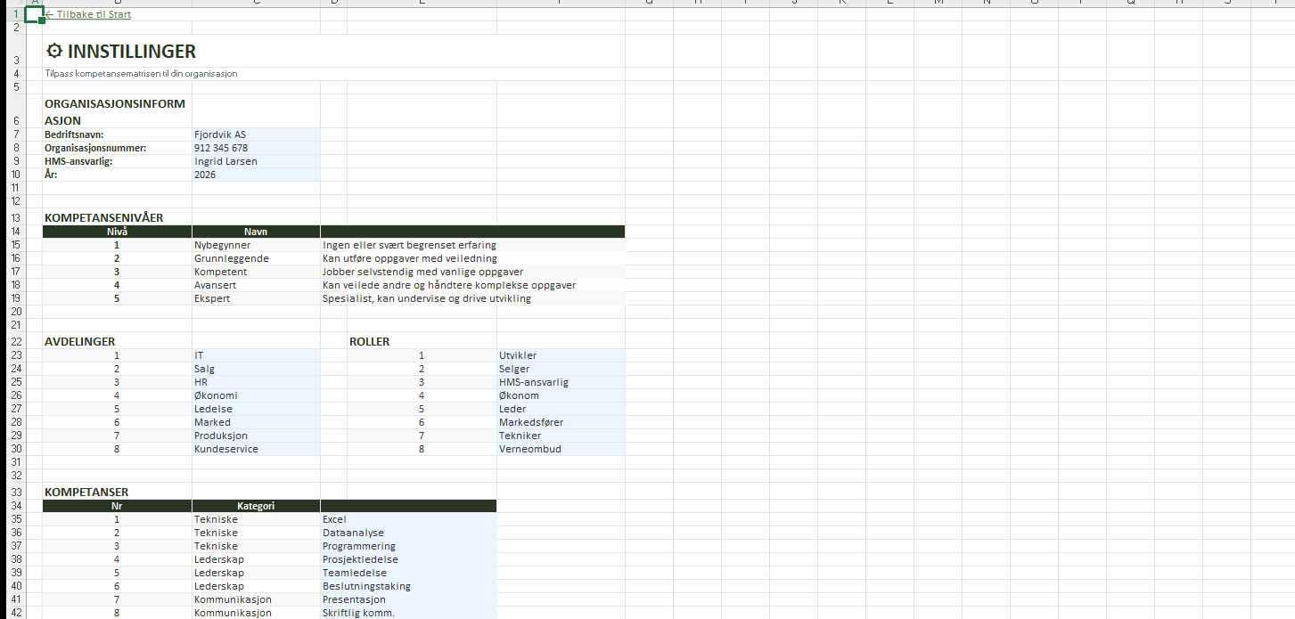 Tilpass malen til din organisasjon: avdelinger, roller (inkl. verneombud og HMS-ansvarlig), kompetanser, opplæringstyper og statuser. Alle endringer spres automatisk til nedtrekksmenyer i øvrige faner.