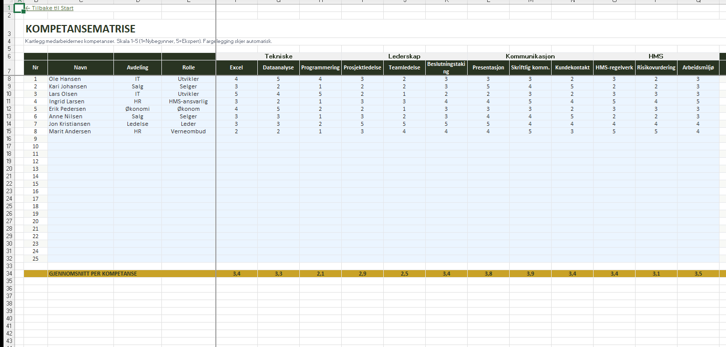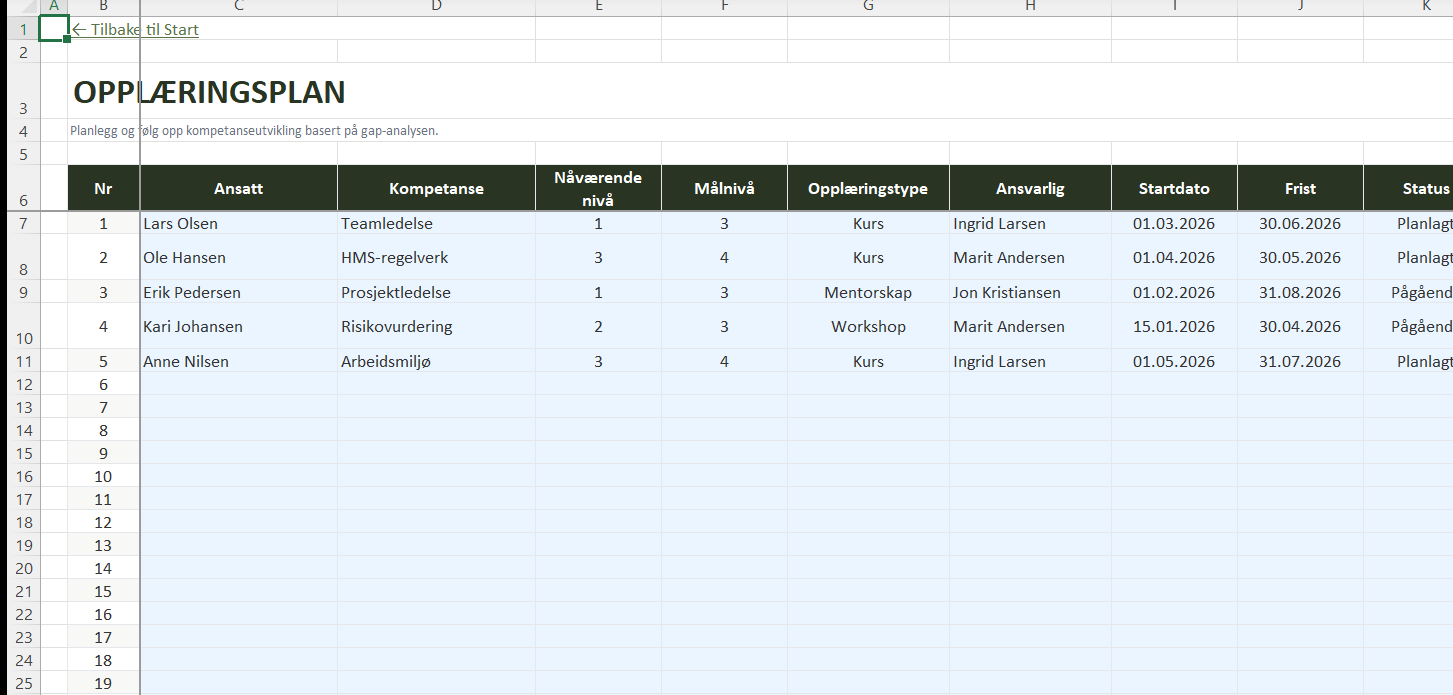 Last ned kompetansematrisen i Excel og få full oversikt over kompetanser, gap og opplæringsbehov.