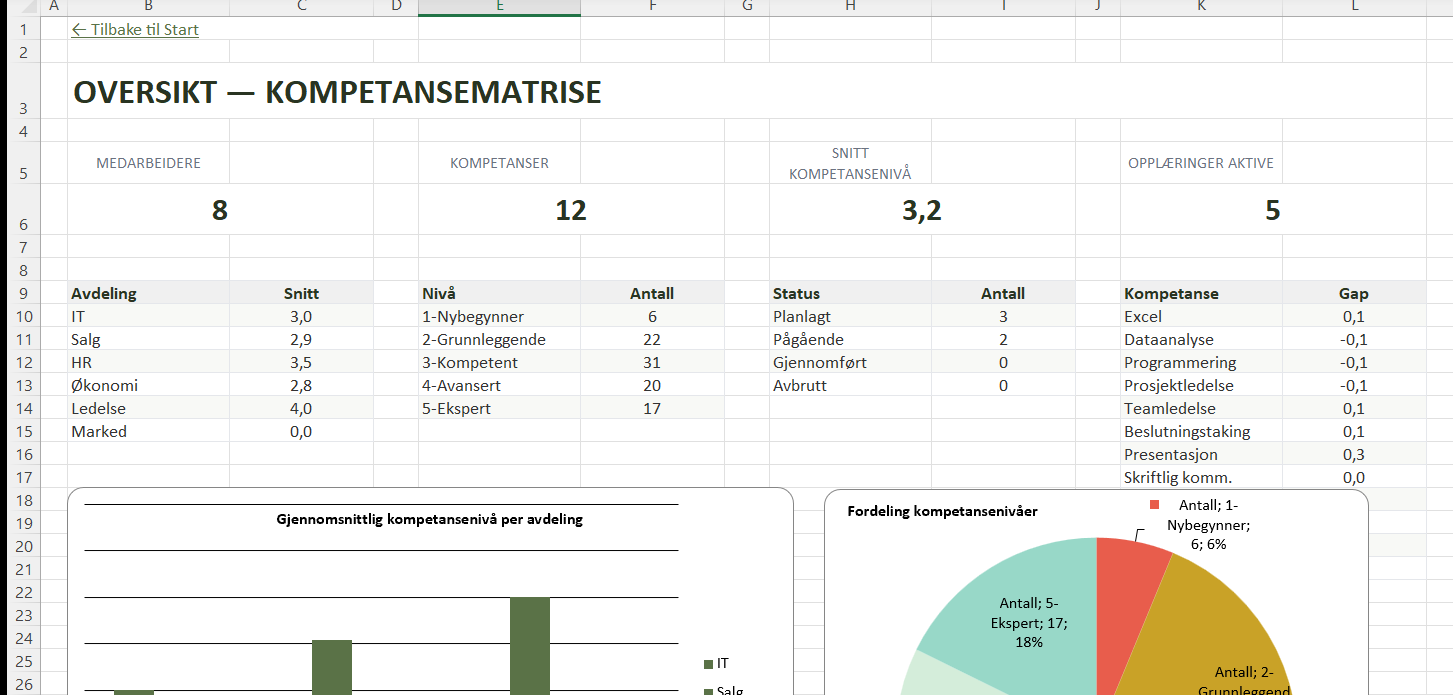 Visuell oversikt med 4 diagrammer: søylediagram (snitt per avdeling), kakediagram (nivåfordeling), kompetansegap per område, og opplæringsstatus. Alle verdier beregnes automatisk.